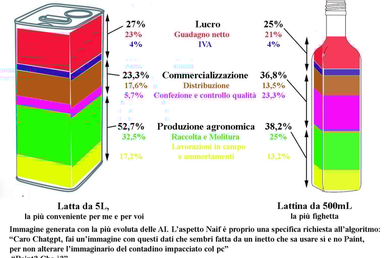 Come è proprio di ogni azienda professionale, anche la gloriosa Az. Agr. Micele è usa fare i conti a fine campagna. Visto che i guadagni non sono pubblicabili perchè il numero è così grande che dovrei affittare altro spazio sul server per contenerlo tutto, mi limito a pubblicare questo straordinario elaborato che illustra come si compone il prezzo finale dell'olio.